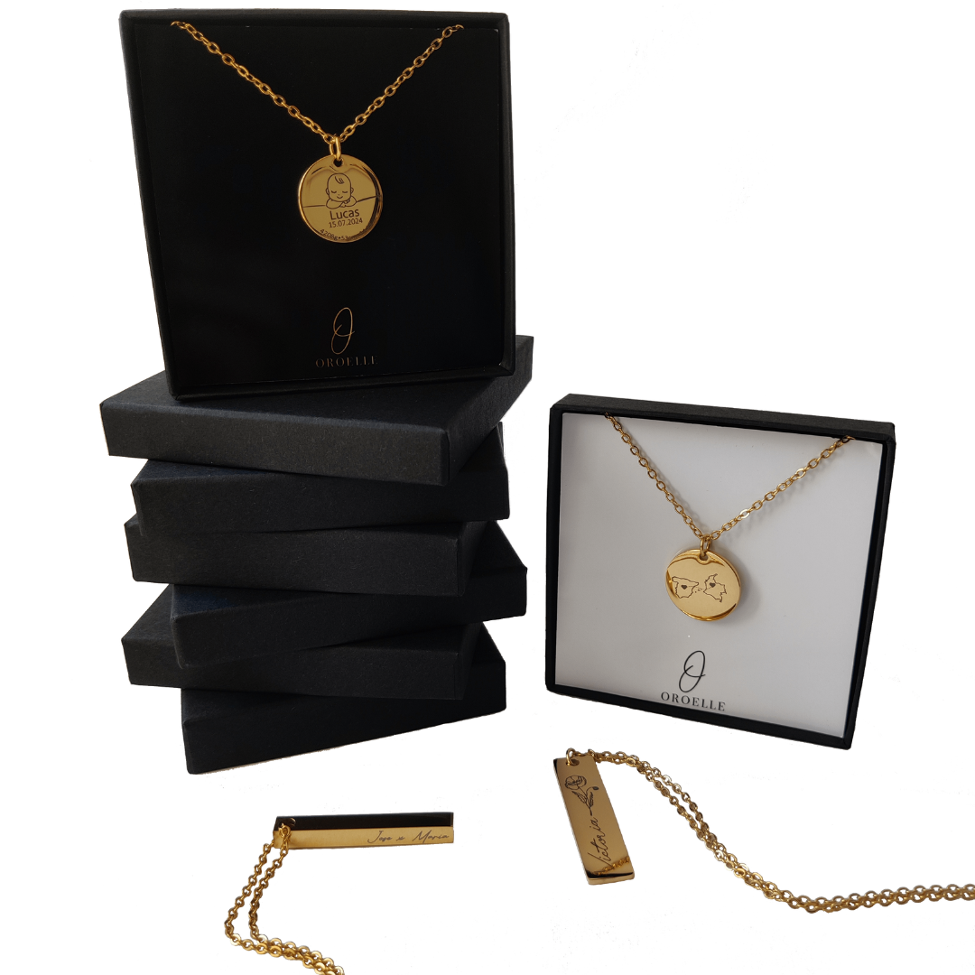 En Oroelle, nos enorgullece crear joyas personalizadas que son únicas, hechas especialmente para ti. Cada collar se graba con precisión para cumplir con nuestros altos estándares y reflejar tu estilo personal. Descubre el arte y la dedicación que ponemos en cada pieza, haciendo que tu joyería sea tan especial como tú.